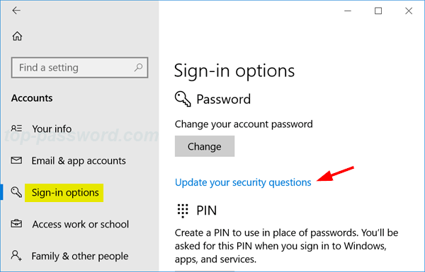 自 2018 年 4 月更新(版本 1803)以来,Windows 10 允许您向本地用户帐户添加安全问题。只需打开“设置”应用程序,导航至“帐户”->“登录选项”,然后单击“更新您的安全问题”链接。选择所需的问题并输入您的答案。
