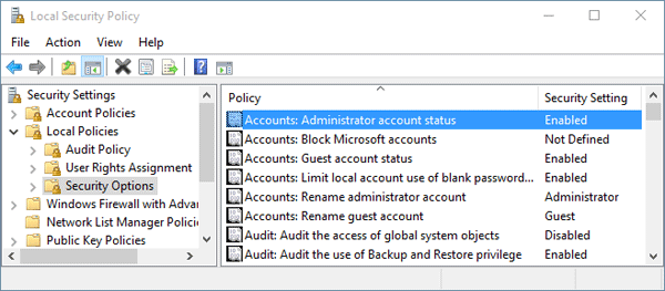 - 当“本地安全策略”窗口打开时,展开当地政策>安全选项。在右侧窗格中,双击策略“帐户:管理员帐户状态”并将其设置为启用。