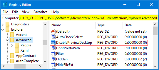 HKEY_CURRENT_USER\Software\Microsoft\Windows\CurrentVersion\Explorer\Advanced - 双击名为的 DWORD 值禁用预览桌面在右侧窗格中,如果要启用 Aero Peek,则将其值设置为 0;如果不使用 Aero Peek,则将其值更改为 1。