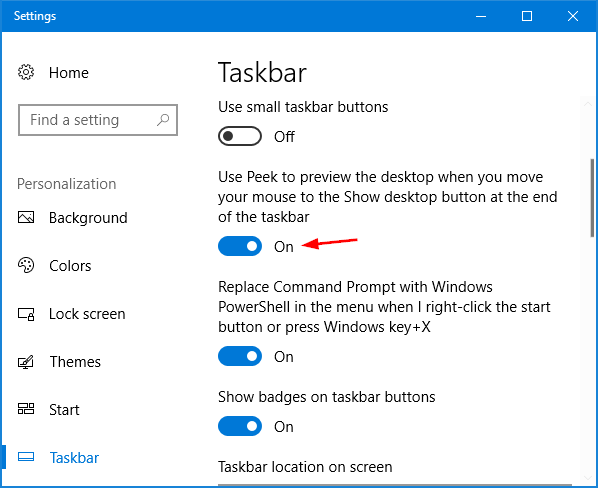 在任务栏设置窗口中,只需切换“当您将鼠标移动到任务栏末尾的“显示桌面”按钮时,可以使用 Peek 预览桌面”选项打开或关闭以启用或禁用 Aero Peek。
