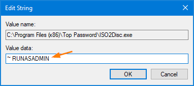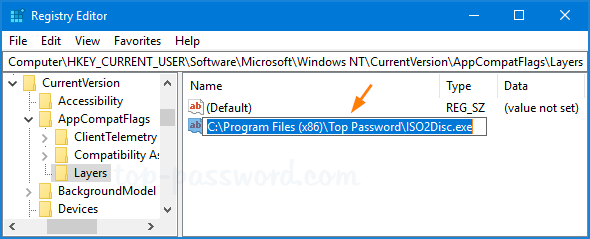 - 将 String 值重命名为您想要始终以管理员身份运行的程序的完整路径,然后双击它进行修改。