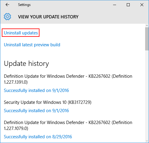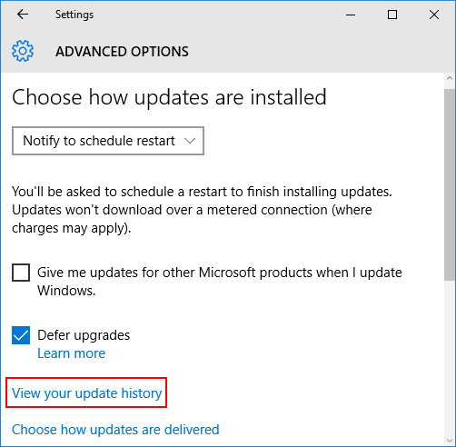 - 单击查看您的更新历史记录链接可查看 Windows 10 电脑上安装的所有更新。