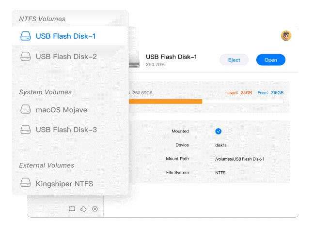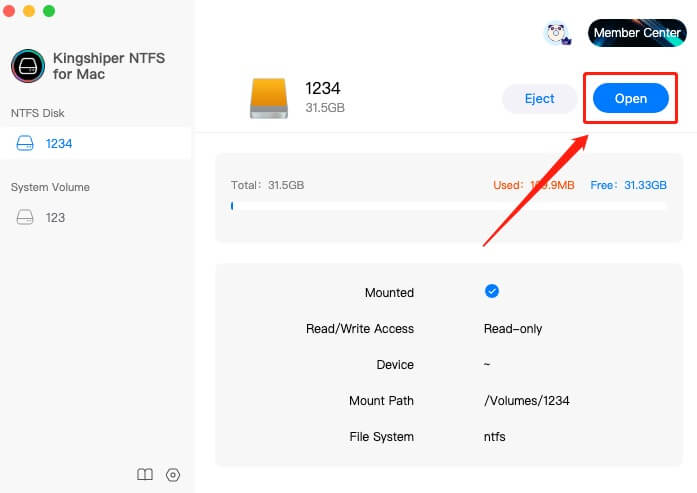 在桌面上启动 Kingshiper NTFS for Mac,选择 NTFS 磁盘,然后单击“打开” 在右上角。