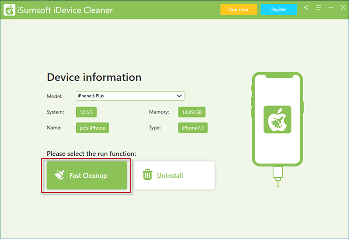 iSoft iDevice Cleaner 可以识别连接到 PC 的设备,并使您能够删除 iPhone 上的垃圾文件或不需要的应用程序。