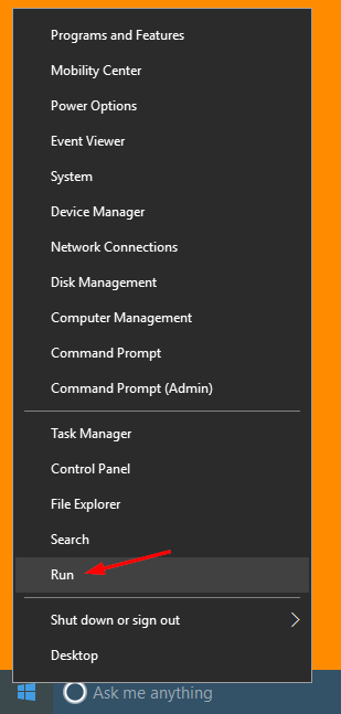 按视窗键+X键盘快捷键(或右键单击开始按钮)。当出现高级用户菜单时,单击跑步。