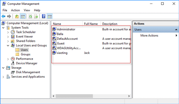 步骤 2:展开“系统工具”>“本地用户和组”,然后选择“用户”文件夹,这样它将列出 Windows 10 上现有的所有用户帐户,包括禁用或隐藏的帐户。此外,如果需要,您可以双击每个用户的名称来查看其属性。