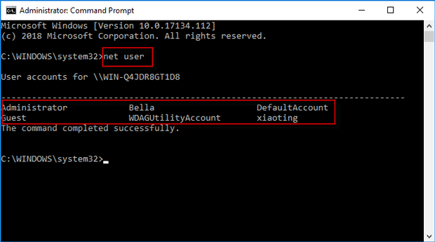 步骤2:输入命令:net user,然后按Enter键,这样就会显示Windows 10上存在的所有用户帐户,包括禁用和隐藏的用户帐户。它们从左到右、从上到下排列。