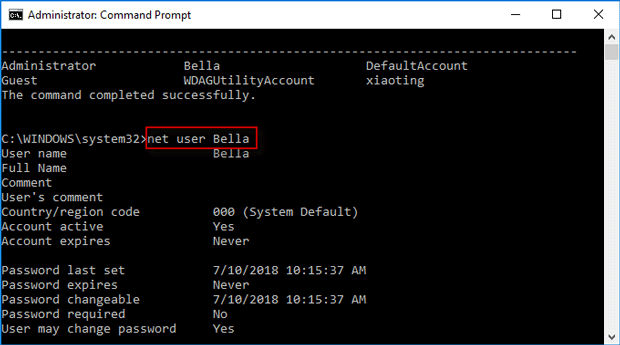步骤3:如果要查看特定用户帐户的详细信息或属性,只需输入命令:net user 用户名,例如net user Bella,然后按Enter键。然后,该窗口显示有关该用户帐户的详细信息和属性,例如其全名、帐户活动状态、是否需要密码等。