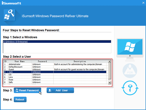 步骤 4:如果您从该启动磁盘正确启动计算机,Windows 密码修复程序应该可以工作并出现在您的屏幕上。它显示您计算机上运行的 Windows 10 并显示 Windows 10 上现有的所有用户帐户的完整列表,包括禁用和隐藏的用户帐户。