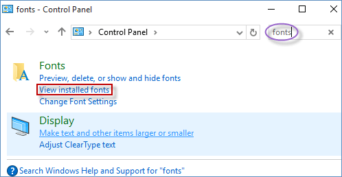 第 2 步:在控制面板对话框,输入字体并选择查看已安装的字体到查看所有字体安装在您的 Windows 计算机或设备上。