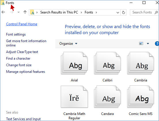 第 2 步:字体窗口显示所有字体安装在您的 Windows 10 计算机中。