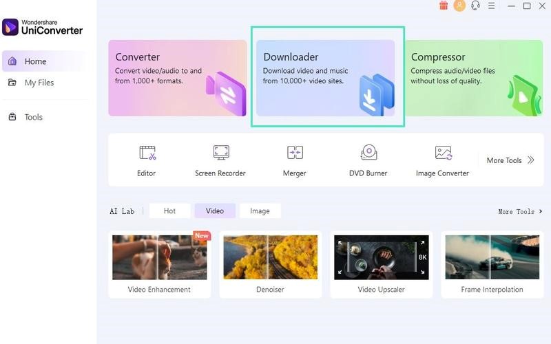 在桌面上安装 UniConverter。启动应用程序并点击仪表板上的“下载器”选项卡。