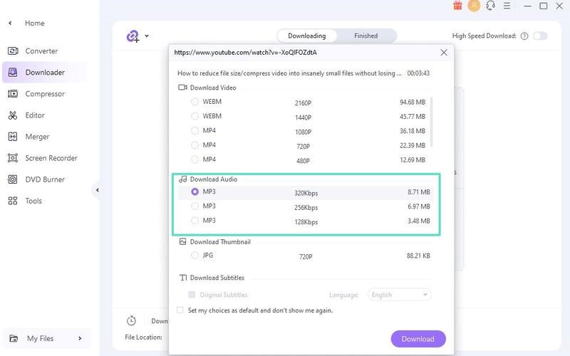 使用在线转换器或类似软件万能转换器,您可以从 YouTube 视频中提取音频作为 MP3。复制视频网址。将其粘贴到您选择的转换器中。选择 MP3 作为输出格式并启动转换。完成后,将转换后的 MP3 文件下载到您的设备。