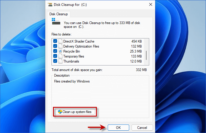 第 2 步:点击清理系统文件,磁盘清理将计算清除系统文件后您将获得的磁盘空间。然后选择不需要的文件并单击好的删除它们。