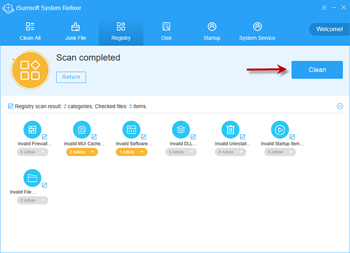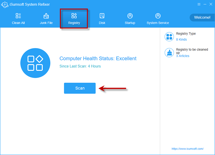 第 1 步:选择登记处选项并单击扫描按钮。然后iSoft System Refixer将自动扫描Windows上的无效注册表项。