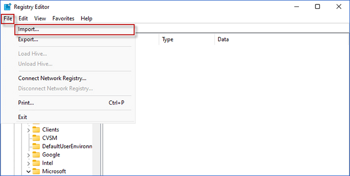 步骤 1:在注册表编辑器中,单击文件并选择工具栏上的进口从注册表备份恢复。