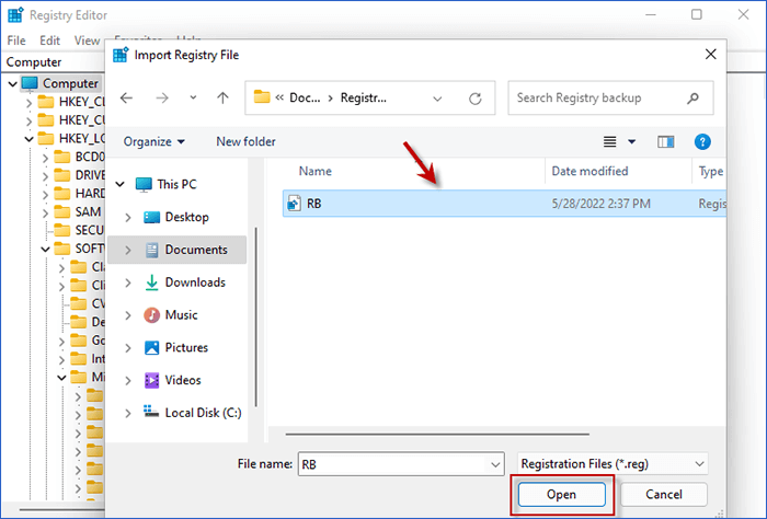 步骤2:浏览并选择PC上的注册表备份,然后单击打开在底部。