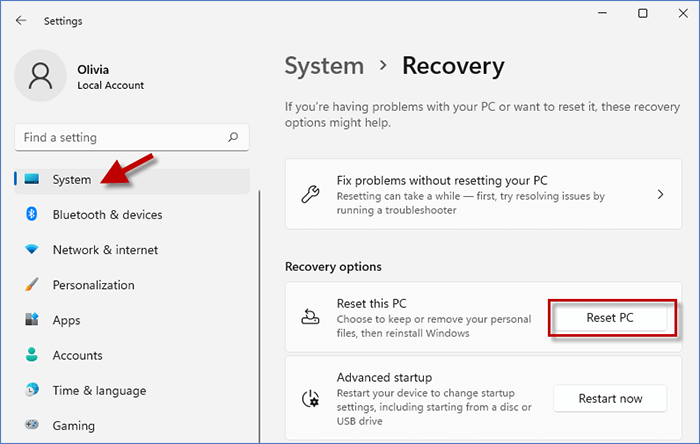 Windows 11:转到设置 > 系统 > 恢复 > 重置电脑