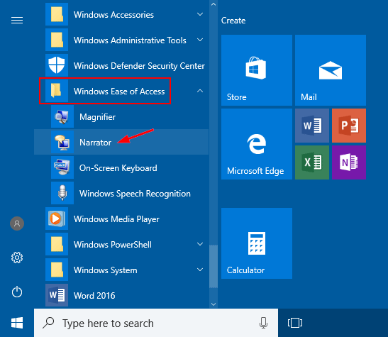 方法 4:从“开始”菜单访问 Windows 10 中的“讲述人”