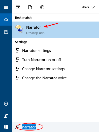 单击任务栏中的 Cortana 搜索框,然后键入叙述者。单击结果中的“讲述人”桌面应用程序。