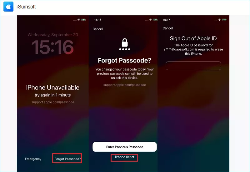 将在右下角看到“Forfot 密码”。在“iPhone 不可用”屏幕中,点击忘记密码>iPhone重置,然后输入您的
