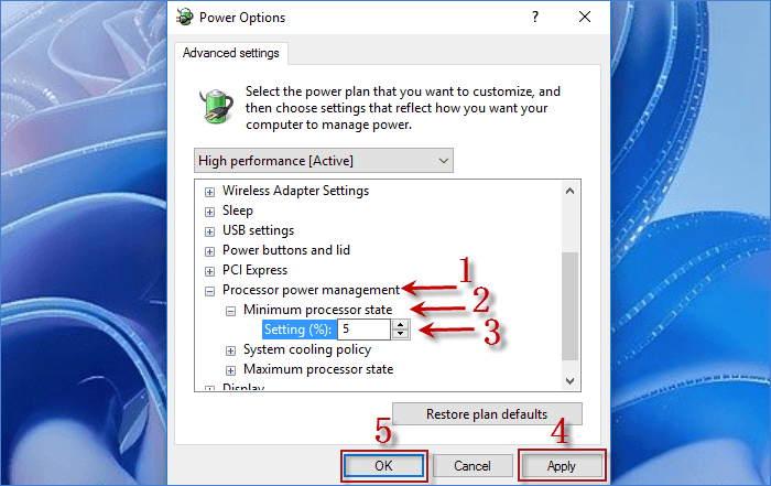 步骤4:扩展处理器电源管理和双击最小处理器状态。旁边环境 (%),将数字设置为5。然后单击申请和好的保存更改。