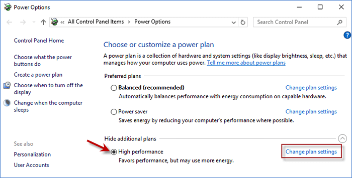 步骤2:在电源选项窗口中,标记高性能然后单击更改计划设置。