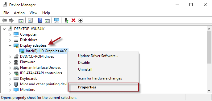 步骤2:查找并扩展显示适配器在设备管理器上。然后右键单击您的图形驱动程序,然后单击特性。
