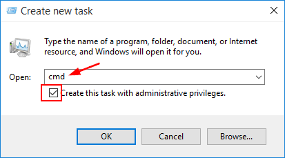 类型指令在打开框中,然后单击好的打开常规命令提示符。您还可以检查“使用管理权限创建此任务”框以管理员身份打开命令提示符。