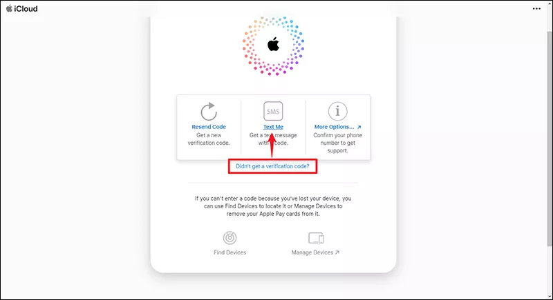 如果您的Apple ID具有两因素身份验证,并且您正在通过新的或不信任的浏览器登录,则将发送验证代码到您的iPhone。由于您无法解锁iPhone查看此代码,因此请单击“没有获得验证代码”,然后选择“文字我”选项。该代码将作为短信发送到您的iPhone。