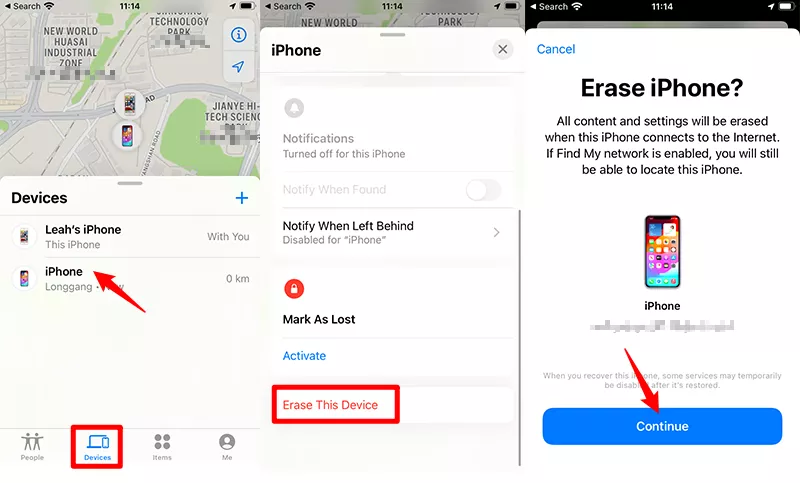 步骤3:点击擦除此设备然后点击继续,然后按照屏幕上的提示。这将删除iPhone中的所有内容和设置,包括密码和面部ID,并解锁iPhone。