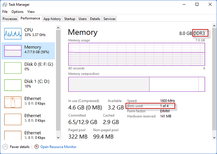 要检查 RAM 容量,您可以输入任务管理器>性能>内存。如果 RAM 太低,无法支持多个应用程序顺利运行,导致您的华硕笔记本电脑运行缓慢,您可以添加更多 RAM 来解决它。