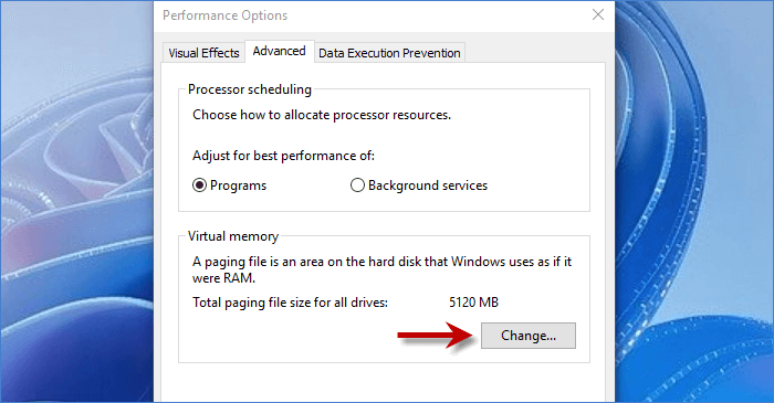 步骤 3:在虚拟内存部分下,单击改变…按钮。