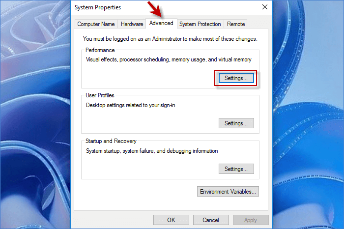 第 2 步:在系统属性窗口,选择先进的选项卡并单击设置。