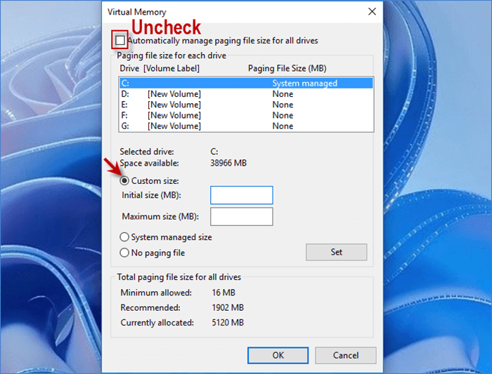 步骤 4:取消选中“自动管理所有驱动器的页面文件大小”,然后单击包含要扩展的页面文件的驱动器。然后标记定制尺寸 并在初始大小或最大大小中输入新大小。最后点击设置和好的。