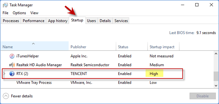 步骤2:在任务管理器中,选择启动选项卡和右键单击具有高启动影响的程序。然后禁用它。