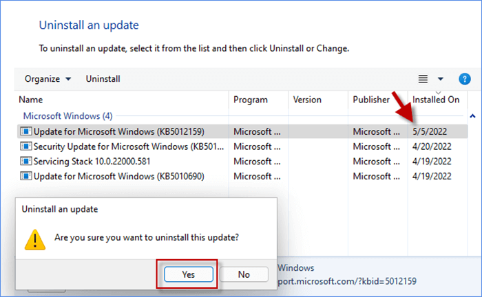 步骤3:双击最新更新并选择是的卸载更新。