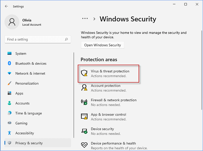 Windows 病毒也可能是 Windows 11 中文件资源管理器无法打开的原因。通常,你的电脑默认受到 Windows 安全保护。虽然有时可能存在漏洞,但您可以通过病毒和威胁防护手动检查病毒威胁。