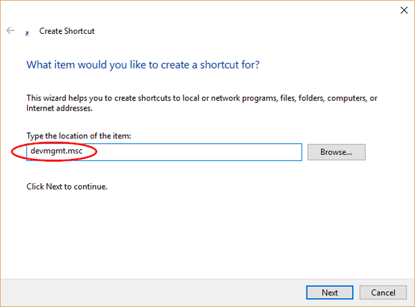 - 复制并粘贴devmgmt.msc在位置字段中,然后单击下一个。