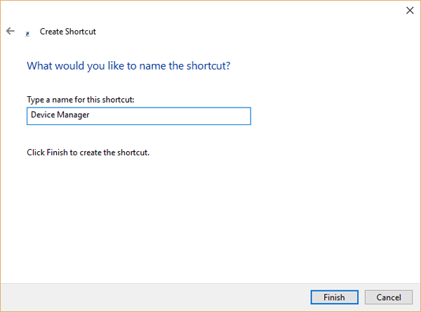 - 系统会要求您命名快捷方式,只需键入设备管理器或任何您想要的内容,然后单击结束按钮。