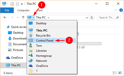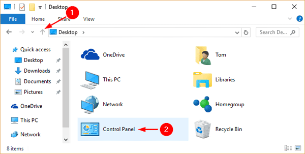 在文件资源管理器中,单击地址栏中左侧的第一个箭头,然后选择控制面板从下拉菜单中。