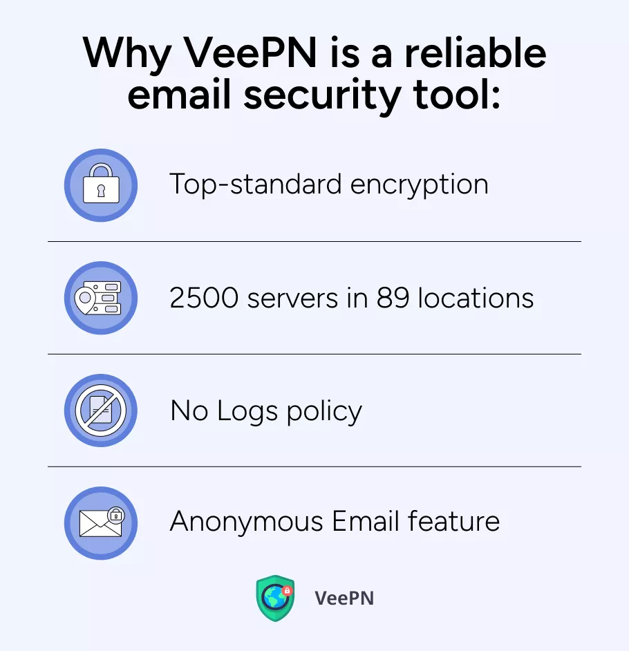 VeePN 提供了一系列功能,使其成为最可靠的电子邮件安全解决方案之一: