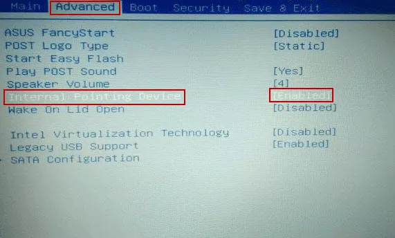 第 2 步:导航至先进的选项卡并找到内部指点设备,
