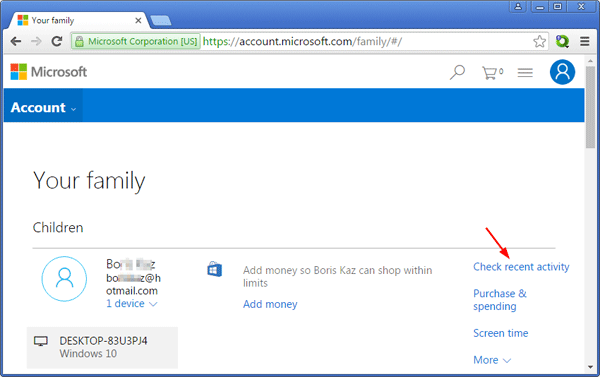 - 要启用家长控制,请访问家庭安全网站并使用您的 Microsoft 帐户登录。这可以通过任何具有互联网连接的计算机或手机来完成。在 Microsoft 家庭设置页面中,选择要为其启用家长控制的儿童帐户,然后单击“检查最近的活动“ 关联。