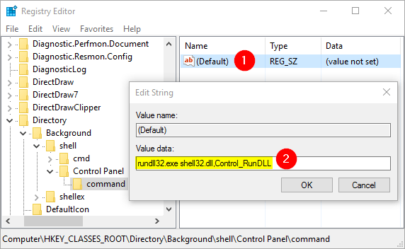 - 选择命令键,然后双击(默认)右窗格中的值。在出现的编辑字符串窗口中,将以下文本粘贴到值数据框中,然后单击好的。