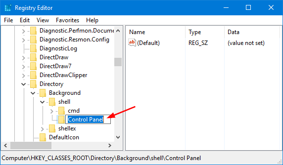 - 关闭注册表编辑器。现在,当您右键单击桌面或文件资源管理器中的任何空白区域时,您将看到“控制面板上下文菜单中的快捷方式。请注意,当您右键单击文件夹或文件时,不会出现此快捷方式。