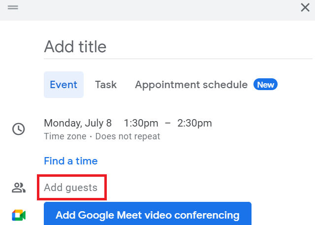 - 添加嘉宾:创建新活动时,单击“添加嘉宾”并输入参与者的电子邮件地址。 Google 日历将发送一封邀请电子邮件,其中包含 Google Meet 链接。
