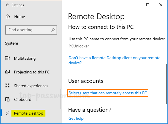 - 打开“设置”应用程序并转至系统->远程桌面。单击选择可以远程访问这台电脑的用户链接在右侧。