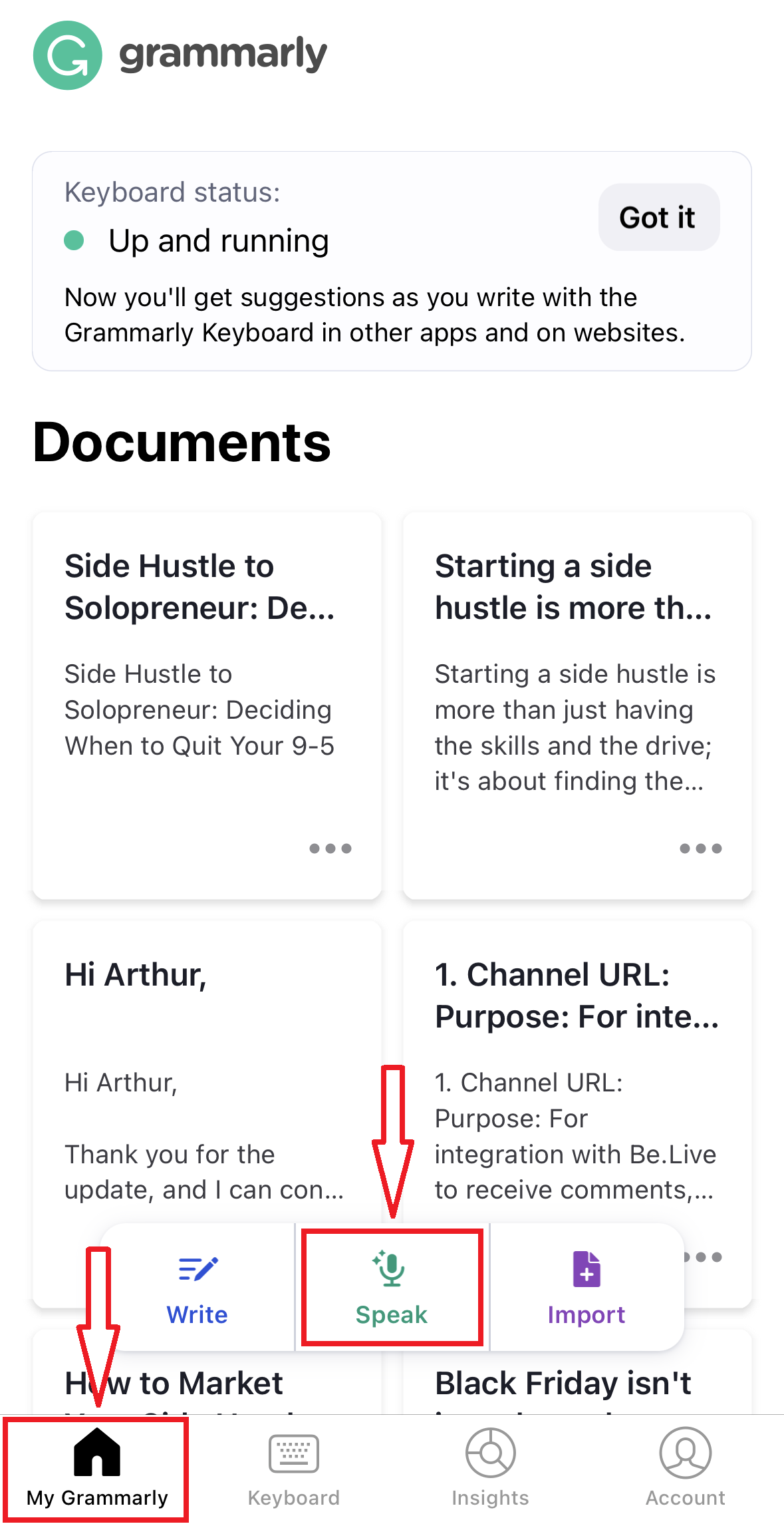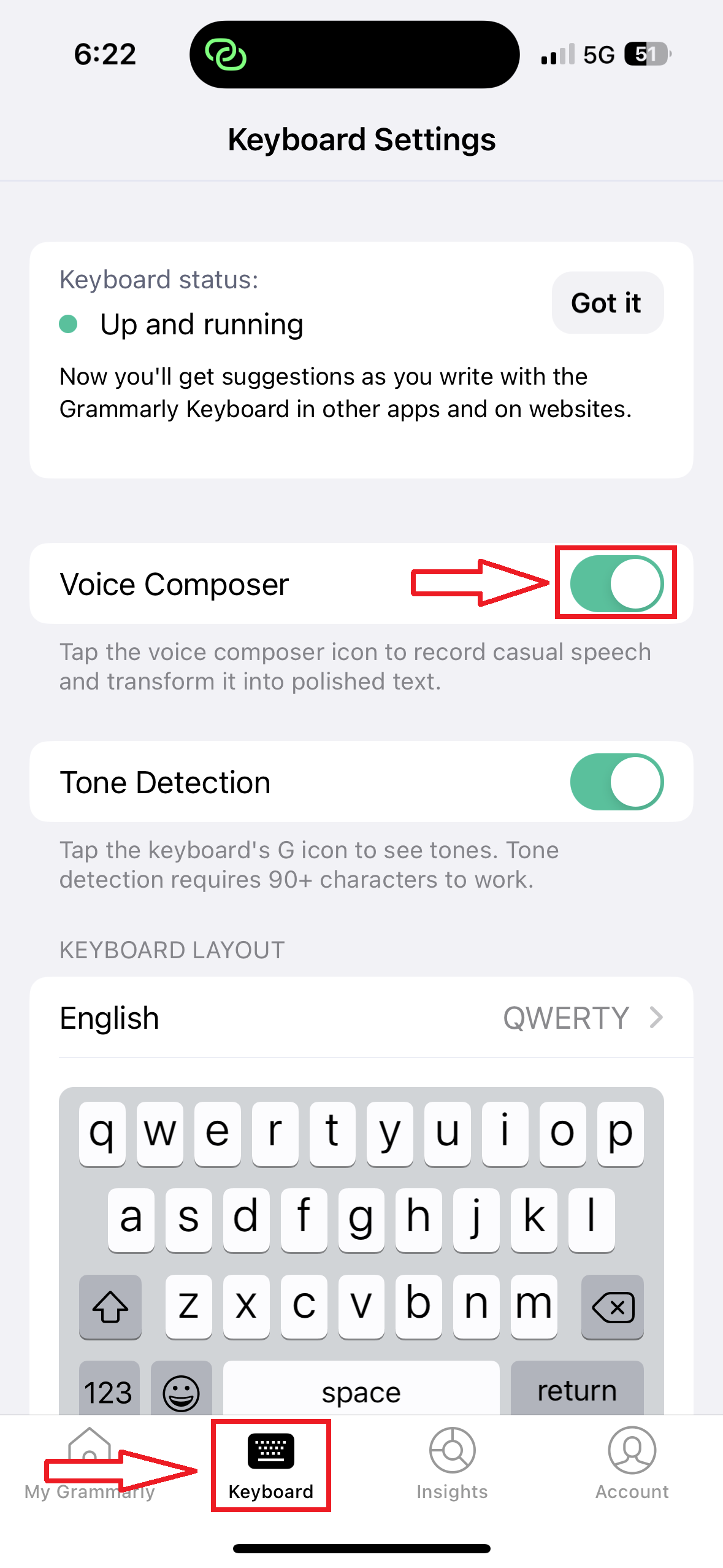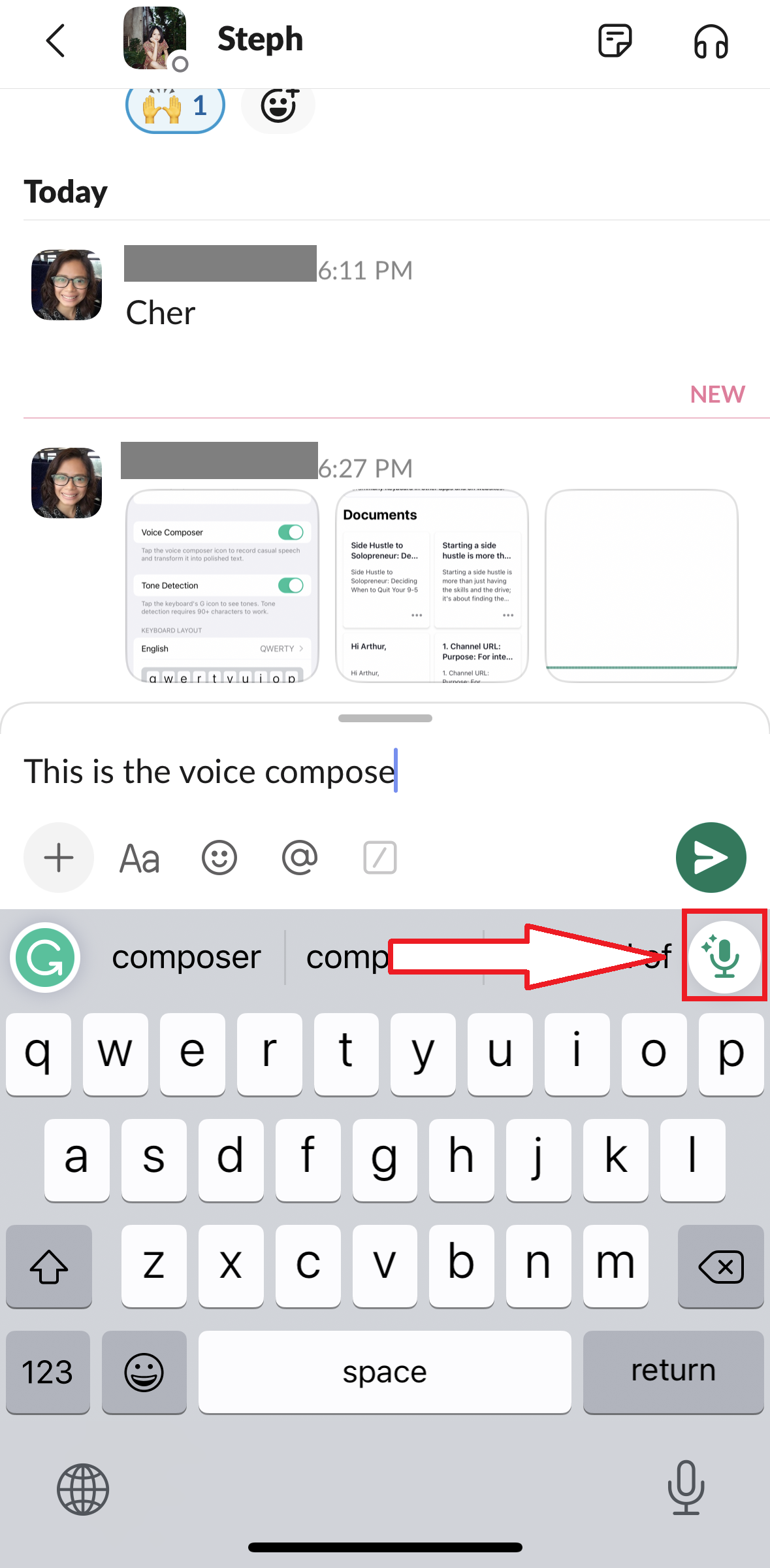 要在 iPhone 或 iPad 版 Grammarly 应用程序上激活 Voice Composer,请按照以下步骤操作: