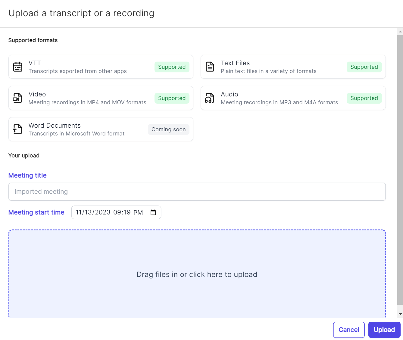 - 您将看到文件上传器窗口,您可以在其中上传或拖动成绩单文件。您还可以指定会议标题及其日期和时间。如果您不提供开始日期,它将自动默认为您上传文件的日期。
